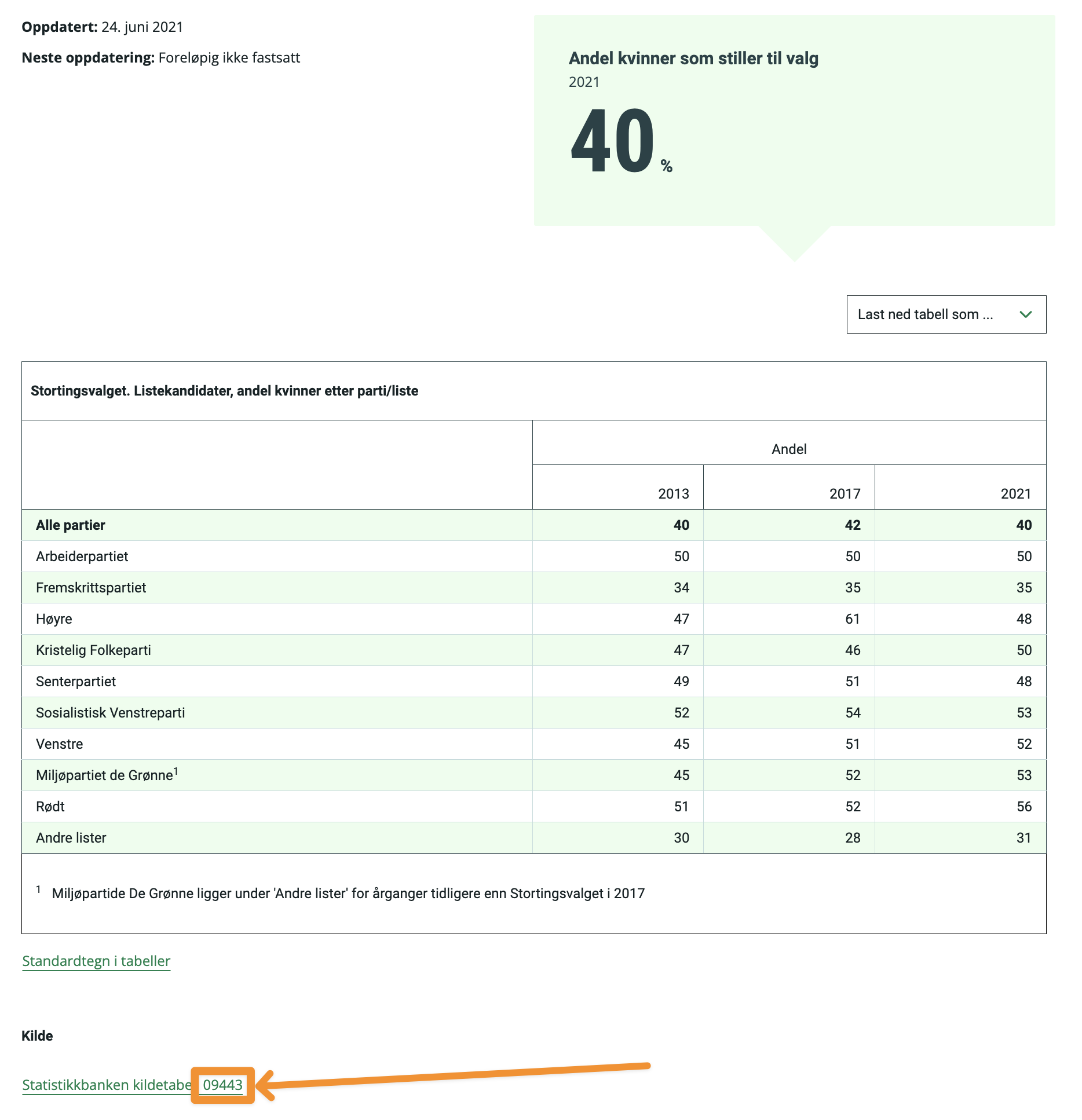 Når du er inne i SSB kan du lete etter en tabell som du ønsker å bruke for å gjøre dine analyser. Se for eksempel på denne tabellen: SSB - Stortingsvalget listekandidater. Dersom du scroller ned litt vil du se at denne tabellen har en kilde, det tallet tar du vare på. Se bilde nedenfor:
