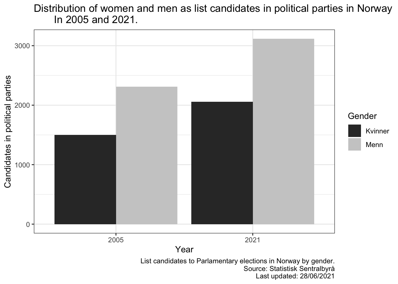 if (!require("PxWebApiData")) install.packages("PxWebApiData")library(PxWebApiData)library(tidyverse)variables <-ApiData("https://data.ssb.no/api/v0/no/table/09443",returnMetaFrames =TRUE)names(variables)values <-ApiData("https://data.ssb.no/api/v0/no/table/09443",returnMetaFrames =TRUE)values[[1]]$values # Regionvalues[[2]]$values # Politisk partivalues[[3]]$values # Kjønnvalues[[4]]$values # Kandidatervalues[[5]]$values # Tidmy_data <-ApiData("https://data.ssb.no/api/v0/no/table/09443",Tid =c("2005", "2021"),Region ="0", PolitParti =c("Alle partier"),Kjonn =c("1", "2") )my_data <- my_data[[1]]head(my_data)comment(my_data)my_data %>%ggplot(aes(x = fireårlig,y = value,fill = kjønn)) +labs(title ="Distribution of women and men as list candidates in political parties in Norway In 2005 and 2021.",x ="Year",y ="Candidates in political parties",fill ="Gender",caption ="List candidates to Parlamentary elections in Norway by gender. Source: Statistisk Sentralbyrå Last updated: 28/06/2021") +theme_bw() +geom_bar(stat ="identity",position ="dodge") +scale_fill_grey()